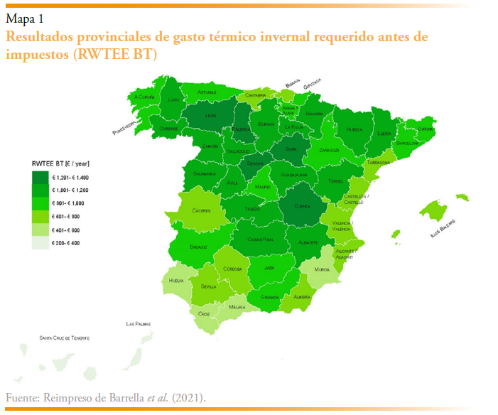 El modelo RENE se propone como una herramienta para mejorar el “diagnóstico energético” en los estudios de pobreza energética. En este sentido, se presentan en la tesis algunos de sus usos directos e indirectos (estos últimos se presentan en los Apartados 4-6). En cuanto a las aplicaciones directas, la tesis emplea el modelo para analizar los gastos relacionados a las “necesidades energéticas invernales”1 (RWTEE,en su sigla inglesa) de los hogares españoles a nivel provincial. El mapa 1 muestra los resultados de este análisis sin impuestos (BT, en su sigla inglesa). Los valores de RWTEE para Ceuta y Melilla (que no se aprecian en el mapa 1), son, respectivamente, 628 euros y 503 euros.