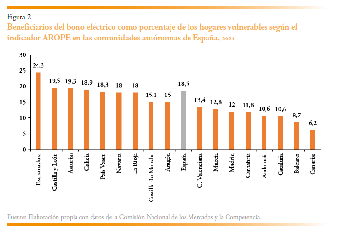 Los dos indicadores de las políticas implementadas en las 17 comunidades autónomas españolas para combatir la pobreza energética durante el período 2010-2022 son de naturaleza diferente. El primero está más orientado socialmente y mide el número de beneficiarios del bono social, ponderado por el número de personas vulnerables en cada región según el indicador AROPE. En España, el bono social, instaurado en 2009 (Real Decreto-Ley 6/2009, de 30 de abril, incluye una serie de ayudas que son proporcionadas principalmente por las compañías eléctricas mediante descuentos directos en las facturas. El grupo objetivo son los consumidores vulnerables, incluyendo hogares con bajos ingresos, familias numerosas, pensionistas y personas en situación de dependencia o discapacidad. Los descuentos varían según el grado de vulnerabilidad del consumidor. Los beneficiarios deben tener contratada la tarifa eléctrica regulada, conocida como precio voluntario para el pequeño consumidor (PVPC), y la potencia contratada no debe superar los 10 kW. El bono social ha experimentado numerosos cambios normativos desde su implantación, modificando las condiciones de acceso a él, tratando de simplificar los dificultosos trámites burocráticos que implica su obtención y aumentando o reduciendo los descuentos en función del contexto social y económico. Hasta enero de 2025, el bono social en España beneficiaba aproximadamente a 1.654.273 hogares (Comisión Nacional de los Mercados y la Competencia, 2025). Este número ha crecido significativamente en los últimos años, después de un descenso muy abrupto sufrido a partir de 2018 debido a los cambios normativos relativos a la potencia contratada y a criterios de renta. En todo caso, todavía no ha recuperado los casi tres millones de beneficiarios que tenían acceso a él en 2009. El coste del bono social (aproximadamente 800 millones de euros al año) se distribuye entre todos los operadores del sector eléctrico según su cuota de mercado, aunque finalmente lo repercuten en sus clientes. En España, aproximadamente el 25 % de los hogares con derecho al bono social lo reciben (Collado Van-Baumberghen & Martínez Jorge, 2024). Esto indica que todavía existe un número significativo de potenciales beneficiarios que no están aprovechando esta ayuda. Los datos sobre los beneficiarios del bono social en cada región de España han sido obtenidos de la Comisión Nacional de los Mercados y la Competencia, concretamente de su base de estadísticas sobre el bono social. La figura 2 muestra las grandes diferencias que se observan entre comunidades autónomas en lo que a la cobertura del bono social con respecto a las personas vulnerables se refiere, con regiones como Extremadura en que el porcentaje es del 24,3 %, mientras que el de otras, como Canarias o Baleares no cubre ni al 10 % de los hogares.