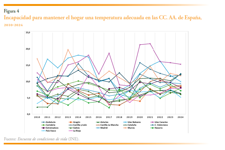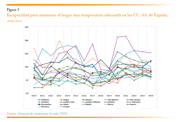 No obstante, los niveles y trayectorias de este indicador varían mucho entre las regiones españolas a lo largo del tiempo. En algunas regiones, como Extremadura, Murcia, Andalucía y Catilla-La Mancha, alrededor de una quinta parte de sus hogares no mantenían una temperatura adecuada en 2024. También presentan cifras muy elevadas Galicia, Cataluña, Comunidad Valenciana y Canarias. Entre las regiones que presentan cifras más moderadas se encuentran País Vasco, Navarra y Aragón. Se observa, además, que todas las regiones excepto Murcia han empeorado el porcentaje de hogares incapaces de mantener una temperatura adecuada en sus viviendas, y algunas han más que empeorado gravemente sus porcentajes a lo largo del periodo, incrementando sus cifras en más de 12 puntos porcentuales. Es el caso de Cataluña, Castilla-La Mancha, Canarias y Madrid. Sin embargo, mientras que el aumento en Castilla-La Mancha ha sido gradual a lo largo del periodo, Cataluña, Canarias y Madrid han empeorado sus cifras especialmente en los dos últimos años. También Andalucía y la Comunidad Valenciana han incrementado sus porcentajes en torno a 10 puntos porcentuales, situándose en registros muy altos. Hay otras regiones que han empeorado sustancialmente sus cifras (más de 10 puntos), pero partían de porcentajes muy bajos al inicio del periodo, con lo que registraron porcentajes en torno al 15 % en 2024. Es el caso de La Rioja, Navarra, Castilla y León, Aragón y las islas Baleares. Todos ellos han visto aumentar acusadamente los hogares con disconfort térmico en los dos o tres últimos años del periodo.