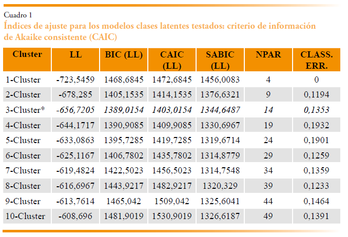 Tal como se indica en la sección 2, se aplicará un análisis de clases latentes (LCCA) para segmentar las 17 regiones españolas en función de las dos principales políticas implementadas para combatir la pobreza energética, descritas en la sección 3. El primer paso del LCCA consiste en seleccionar el modelo más adecuado. Para ello, se evaluaron diez modelos, con un número de clústeres que oscila entre uno (homogeneidad de la muestra) y diez. De acuerdo con el criterio de información consistente de Akaike (CAIC), se eligió el modelo que presentó los valores más bajos en este índice, por considerarse el mejor ajuste. Los resultados presentados en el cuadro 1 indican la existencia de tres grupos. Siguiendo el procedimiento propuesto por García (2017), cada modelo se estimó en diez ocasiones con diferentes valores iniciales aleatorios, y el modelo con tres clústeres conglomerados mostró la mayor consistencia.