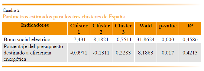 El segundo paso consiste en evaluar la significatividad de los indicadores (cuadro 2). El valor p asociado al estadístico robusto de Wald fue inferior a 0,05 para los dos indicadores propuestos, lo que evidencia que las dos políticas representadas por dichos indicadores son significativas para segmentar las regiones españolas en los tres grupos planteados; es decir, presentan variaciones relevantes entre los clústeres. Asimismo, los valores de R2 muestran que el modelo LCCA explica más del 45 % de la varianza del indicador “bono social” y más del 42 % del indicador relativo al porcentaje del presupuesto regional destinado a financiar mejoras de eficiencia energética en los hogares.