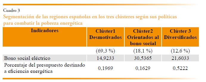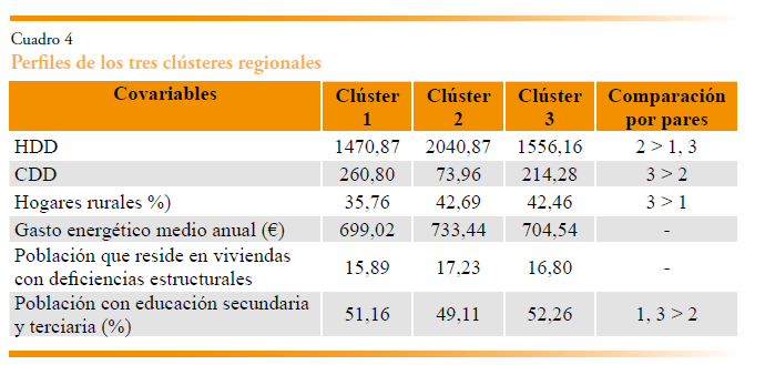 Clúster 3. Los más diversificados. El tercer clúster representa el 12,6 % de la muestra y se caracteriza porque la mayoría de sus regiones orientan sus esfuerzos tanto a la implementación de medidas de eficiencia energética como a políticas de carácter social. Es el grupo que destina, con diferencia, el mayor porcentaje del presupuesto regional anual a mejorar la eficiencia energética de las viviendas: un 0,52 %. Esta cifra más que duplica el porcentaje asignado por las regiones del primer grupo y triplica el destinado por las del segundo. Las comunidades de este grupo presentan temperaturas moderadas, con un número intermedio de días cálidos y fríos. Asimismo, cuentan con una elevada proporción de hogares en zonas rurales, similar a la del segundo clúster, aunque ligeramente inferior, y registran un gasto energético medio intermedio respecto a los otros dos grupos. Finalmente, destaca por su mayor nivel educativo, ya que más de la mitad de su población posee estudios secundarios o terciarios.