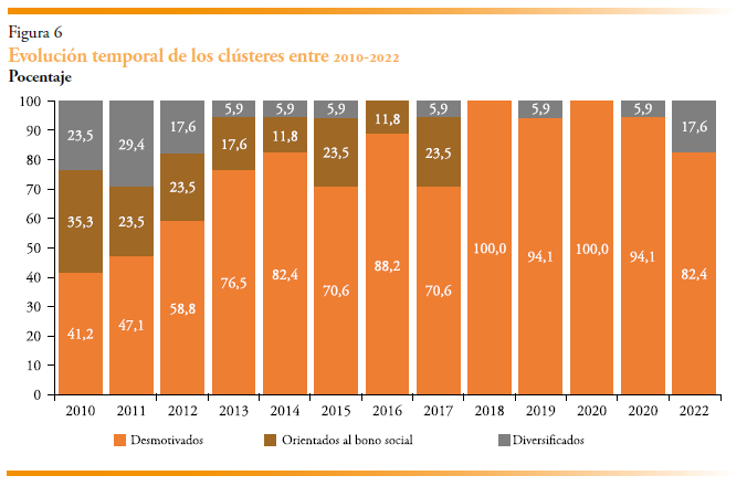 Aunque nuestra muestra es un cross-section de todas las regiones españolas para el período 2010-2022, resulta interesante analizar la dinámica descrita por los tres clústeres a lo largo del tiempo. La figura 6 presenta esta evolución, mostrando cómo ha variado el peso relativo de cada grupo, con algunos ganando importancia y otros perdiéndola. Se observa que, al inicio del período, en 2010, el clúster 1 era el más relevante, agrupando al 41 % de las regiones. Muy pronto comenzó a incrementar su peso de manera progresiva: en 2018 y 2020 llegó a incluir el 100 % de la muestra y, en los últimos cinco años, se ha mantenido entre el 82 % y el 100 %. Por el contrario, las regiones del clúster 2 han ido perdiendo presencia de forma sostenida, pasando del 35 % en 2010 a su punto más bajo en 2018, cuando ninguna región pertenecía a él. Este valor del 0 % se mantuvo hasta 2022. Finalmente, el clúster 3 representaba el 23,5 % en 2010 y 2011; en 2012 descendió al 17,6 % y en 2013 volvió a caer significativamente hasta el 5,9 %. Este nivel se mantuvo entre 2013 y 2021, salvo en 2016, 2018 y 2020, cuando se redujo a 0 %. En 2022 recuperó el 17,6 %. En síntesis, aunque en los primeros años los tres clústeres estaban relativamente equilibrados, con el tiempo se han producido transferencias principalmente hacia el grupo 1. Solo al final del período el grupo que combina políticas sociales y de eficiencia energética ha recuperado peso.