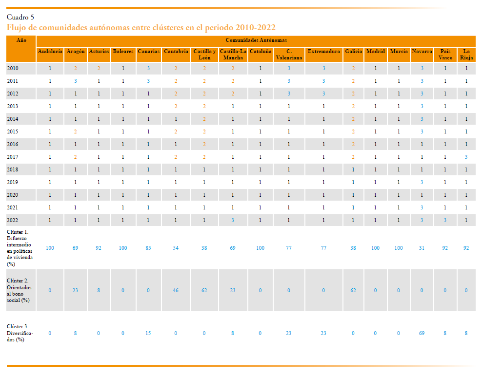El cuadro 5 muestra las transiciones por comunidad autónoma durante el período 2010-2022. Algunas regiones han permanecido en el clúster 1 a lo largo de todo el período, como Andalucía, Baleares, Cataluña, Madrid y Murcia. Otras comenzaron en los otros dos grupos, pero pronto se trasladaron al clúster 1; este es el caso de Asturias, que pasó del grupo 2 al 1, y de Canarias, Comunidad Valenciana y Extremadura, que se movieron del 3 al 1. Se observan comunidades, principalmente en el noreste de España, que durante la mayor parte de los años —especialmente en la primera mitad del período, hasta 2017— pertenecieron al clúster 2 y, al final, transitaron al 1. Cantabria, Castilla y León y Galicia son ejemplos de esta transición. Aragón y Castilla-La Mancha son casos particulares, pues han pasado por los tres clústeres, aunque la mayoría de los años han estado en 1. Castilla-La Mancha perteneció al grupo 2 entre 2010 y 2012, luego pasó al 1 y, en el último año del período, se ubicó en el 3. Aragón estuvo en el grupo 1 en 2010, en el 2 en 2011 y, posteriormente, otra vez en el 1, salvo en 2015 y 2017. Finalmente, Navarra ha permanecido la mayor parte del período en el clúster 3, salvo entre 2016 y 2018, y en 2020, cuando se trasladó al 1.