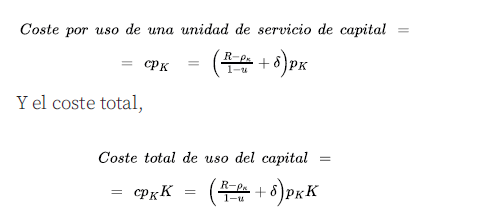 El precio sombra o coste unitario por uso del capital corresponde a la restricción de acumulación y se determina por (Jorgenson, 1963; Hall y Jorgenson, 1967):