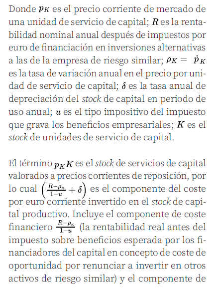 El coste promedio por unidad de servicio de capital cpk, y por euro invertido, c es, respectivamente, 19 % y 15 % anual. La diferencia explica por la evolución del precio de mercado por unidad de servicio de capital, pk (evolución del deflactor de la FBCF). El coste c = 15 % es igual a 9 %, depreciación del capital (promedio), y 6 %, coste financiero real antes de impuestos (promedio).