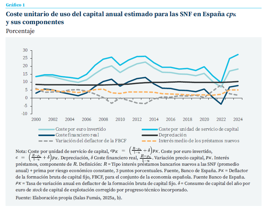 El coste por uso total incluye un coste unitario, cpk, y un stock de unidades de servicios de capital, K. La fuente del stock de capital estimado para el agregado de las SNF en España es Salas Fumás (2025b). El cálculo del coste unitario se resume en el gráfico 1.