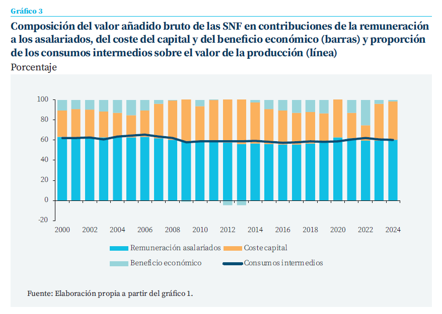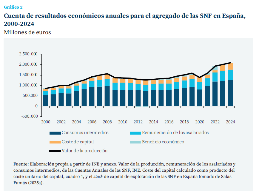 Con las perturbaciones durante y después de la pandemia, en 2024 el coste de uso del capital alcanza su máximo absoluto con 317300 millones de euros corrientes, el 15 % del valor de la producción.