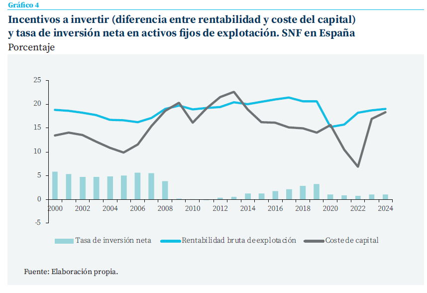 Entre 2000 y 2007, la rentabilidad del capital supera holgadamente al coste del capital y la tasa de inversión neta alcanza el 5 % anual (cifra próxima a lo que crece el stock de servicios de capital). A partir de 2009 y hasta 2013, la rentabilidad y el coste del capital prácticamente coinciden, los incentivos a ampliar capacidad desaparecen y la tasa inversión neta es prácticamente nula. Entre 2014 y 2019, vuelven los incentivos positivos a ampliar capacidad productiva y la tasa de inversión neta muestra una evolución ascendente en el tiempo. La pandemia de la COVID-19 interrumpe el crecimiento, la tasa de inversión neta desciende y se mantiene en niveles muy bajos hasta el final del periodo. Se constata así el retraso en la recuperación de la inversión empresarial en los últimos años, en comparación con la recuperación de la actividad y el empleo. La explicación de este retraso a partir del gráfico 4 es la falta de incentivos a invertir: la rentabilidad del capital sigue por debajo de los niveles de 2019 y el coste del capital sufre las presiones de una prima de riesgo alterada por las tensiones económicas y políticas.