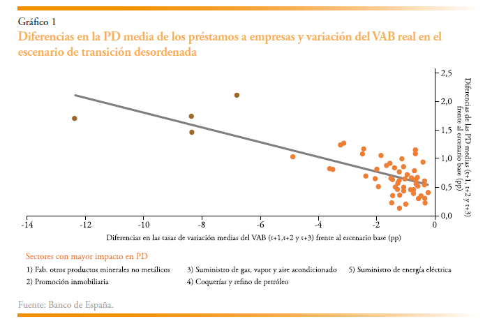 El Banco de España concluye que “el ejercicio muestra que los impactos de los escenarios de transición a corto plazo sobre la rentabilidad y la solvencia del sector bancario español son moderados, si bien el impacto en la PD y en la situación financiera es heterogéneo entre sectores. En particular, los sectores más vinculados a la emisión de gases de efecto invernadero resultarían ser los más afectados” (BE, 2021).