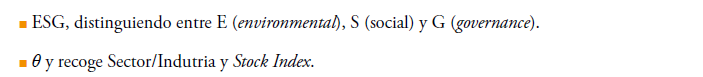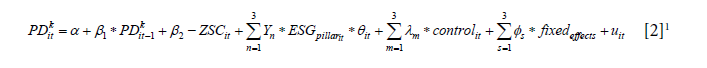 Similar al estudio realizado por el BE bajo el marco de pruebas FLESB que anteriormente hemos mencionado, pero con variaciones, los autores Palmieri et al. (2023), utilizando una muestra europea de 211 empresas que cotizan en bolsa entre 2013 y 2022, analizan el impacto sobre la probabilidad de impago (PD) de las empresas mediante la influencia del desempeño ESG combinado con la afiliación a un sector o índice bursátil, bajo el siguiente modelo: