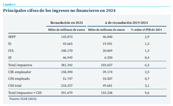 En perspectiva temporal, el conjunto de ingresos no financieros muestra un avance muy intenso desde 2019, con un incremento acumulado de 153,3 miles de millones de euros, equivalente a 9,6 puntos del PIB de 2024. De manera particular, el aumento de impuestos entre 2019 y 2024 ha sido de 103,6 miles de millones de euros. El IRPF ha sido el gran motor de esta tendencia alcista con 46,8 miles de millones, equivalente a 2,9 puntos del PIB de 2024. Este fuerte impulso se explica por la combinación de un mayor número de ocupados, aumento de salarios nominales y el fuerte efecto de la progresividad en frío.