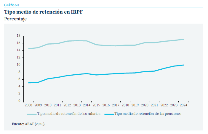 6 El tipo de retención de pensiones recogido en el gráfico incluye a la totalidad de pensiones. Sin embargo, la pensión media total es inferior a la de jubilación: en 2024, 1.282 frente a 1.450 euros.
