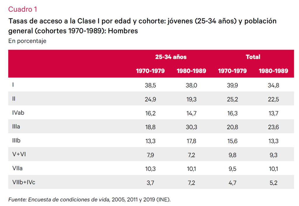 El cuadro 1 muestra cómo varía el acceso a la élite profesional (Clase I) entre hombres jóvenes (25–34 años) y el total de la población, según clase de origen y cohorte de nacimiento. Permite observar si las oportunidades de ascenso han cambiado entre generaciones y si existen patrones de reproducción o bloqueo social, distinguiendo los efectos de la madurez biográfica y los puramente generacionales correspondientes a distintos momentos históricos.