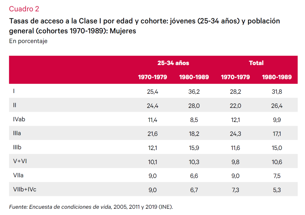 En el caso de las mujeres (cuadro 2), se observa un escenario más dinámico, pero también más desigual. En términos generales, las tasas de acceso a la Clase I aumentan entre las cohortes más jóvenes, aunque de forma muy desigual según la clase de origen. Las mujeres procedentes de la Clase I son las que más progresan: su capacidad de autorreproducción mejora de manera notable tanto entre las jóvenes como en el total de la población. También se registran avances entre las mujeres de Clase II, lo que contrasta con el retroceso observado entre los hombres de ese mismo origen.