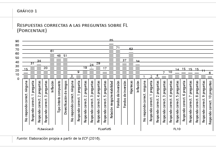 El gráfico 2 presenta el porcentaje de aciertos en cada una de las preguntas que componen los índices FLBásicas3 y FLSofisticadas5. Como se ve, el mayor número de aciertos en las preguntas que aproximan las habilidades básicas se da en la pregunta relativa a la disminución de la capacidad de compra que implica la inflación (61 por ciento del total de entrevistados la aciertan). Por el contrario, la pregunta que parece más difícil para los encuestados es la relativa al tipo de interés compuesto: solo el 48 por ciento de los entrevistados la contestan correctamente, resultado preocupante dada la relevancia de este concepto en la adopción de decisiones financieras correctas. La pregunta sobre la reducción del riesgo que conlleva la compra de una variedad amplia de acciones es contestada correctamente solo por el 51 por ciento de los individuos de la muestra.