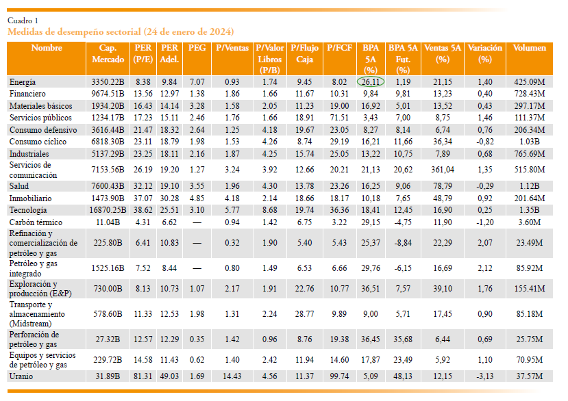 Más recientemente, al observar los datos del 24 de enero de 2024, se identifica nuevamente el mismo fenómeno, tal y como se puede observar en el cuadro 1. Los sectores están ordenados según su ratio precio-beneficio, que corresponde a la segunda columna. De nuevo, el sector energético presenta la ratio P/E más bajo, alrededor de 8, frente a valores cercanos a 38 en el sector tecnológico. En el círculo verde se indica que los beneficios por acción del sector energético crecieron un 26 % en los últimos cinco años, pero se espera que aumenten únicamente un