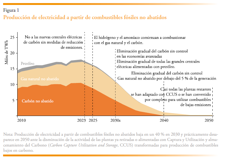 Entonces, ¿es realmente el riesgo de terminación una explicación plausible para las empresas de energía fósil? Consideremos el modelo de la Agencia Internacional de la Energía sobre cómo debería ser la transición desde el presente hasta 2050. Existen numerosos pasos intermedios en este proceso, pero la representación mostrada en la figura 1, que incluye carbón, gas y petróleo utilizados para la generación eléctrica, resulta especialmente ilustrativa. Actualmente nos encontramos en el punto máximo de utilización de estos combustibles, y todo indica que su uso irá disminuyendo progresivamente.