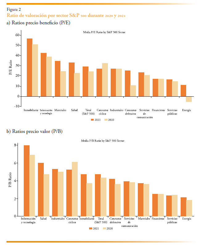 ¿Qué se observa cuando analizamos las ratios de beneficios en los años 2020 y 2021? En la figura 2 se aprecia que los sectores energéticos se sitúan sistemáticamente en los valores más bajos en ambos años. De hecho, en 2020 —el año de la pandemia— presentan beneficios negativos. Si se analizan las ratios precio-valor contable, se observa el mismo patrón. Por tanto, estos dos años son coherentes con la hipótesis del riesgo de terminación.