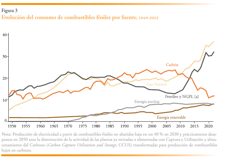 ¿Qué está ocurriendo con los datos de consumo energético? La figura 3 muestra setenta años de datos sobre consumo de energía. Se observa que las energías renovables aumentan de forma sostenida, mientras que la energía nuclear permanece relativamente estable. El consumo de carbón disminuye, lo que sugiere claramente una trayectoria de terminación. Sin embargo, el petróleo y el gas no muestran aún una tendencia descendente clara, lo que plantea la cuestión de si los agentes económicos realmente anticipan una reducción futura de su uso.