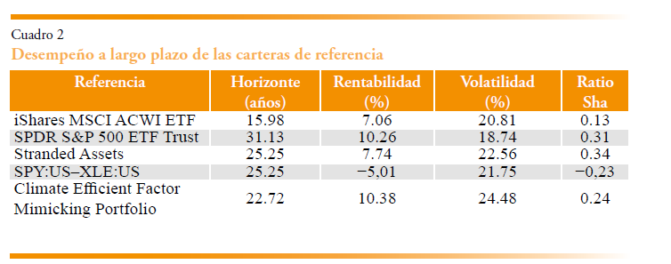 Una alternativa más estadística es la cartera de factores eficiente frente al clima (Climate Efficient Portfolio, CEP), que se construye como una cartera de fondos sostenibles a partir de nuestra base de datos, la cual contiene unos 200 de estos fondos. El objetivo es obtener una cartera long-only, de mínima varianza y máxima correlación con noticias climáticas, condicionada a factores de riesgo estándar, rendimientos del petróleo y la cartera de activos varados. Estas carteras se reequilibran mensualmente y son plenamente invertibles.