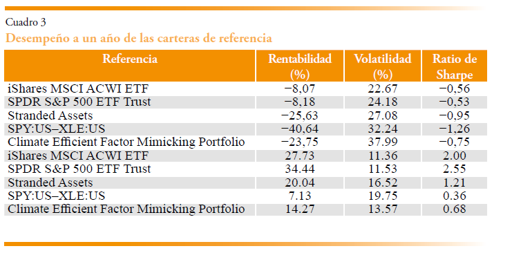 Examinamos su comportamiento en el largo y corto plazo e ilustramos los resultados en los cuadros 2 y 3, respectivamente. El cuadro 2 muestra los resultados para SPY, ACWI, SA, CEP y una cartera de cobertura que no diferencia al carbón. Todas las rentabilidades reportadas son fuera de la muestra (out of sample). El análisis del rendimiento a largo plazo refleja que estas carteras presentan resultados comparables a los de las carteras de mercado amplio. El rendimiento relativo depende de la intensidad de las noticias climáticas a lo largo del tiempo. En periodos prolongados de aumento del riesgo climático, estas carteras pueden superar al mercado. En particular, la cartera de activos varados presenta la mayor ratio de Sharpe, seguida por SPDR y CEP.
