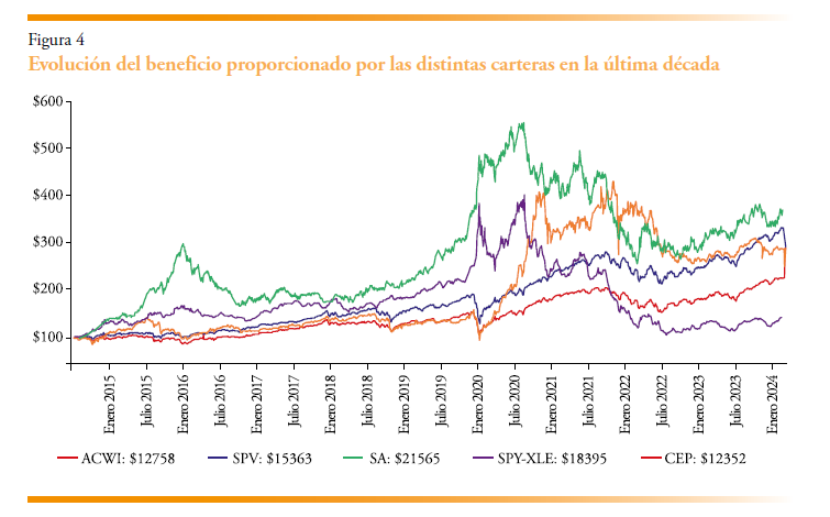 La figura 4 muestra la evolución de las distintas series durante el periodo comprendido entre 2014 y 2024. La cartera de activos varados, representada en verde, tuvo un desempeño extremadamente bueno antes y durante la pandemia, aumentando de forma pronunciada desde enero de 2019 hasta finales de 2020. Posteriormente descendió hasta enero de 2023, pero desde entonces se ha recuperado. El CEP, representado en naranja, aumentó con fuerza desde marzo de 2020 hasta enero de 2022, cayó en 2022 y se ha recuperado en 2023.