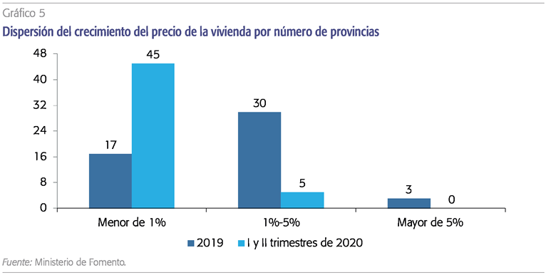 En definitiva, si en nuestro anterior escenario anticipábamos una desaceleración para 2020, las perspectivas son ahora peores. A la luz de las tendencias en curso, se puede prever una reducción del precio medio de la vivienda de entre el 5% y el 8% para el conjunto del año. Esta evolución corregiría la leve sobrevaloración constatada en el anterior análisis.