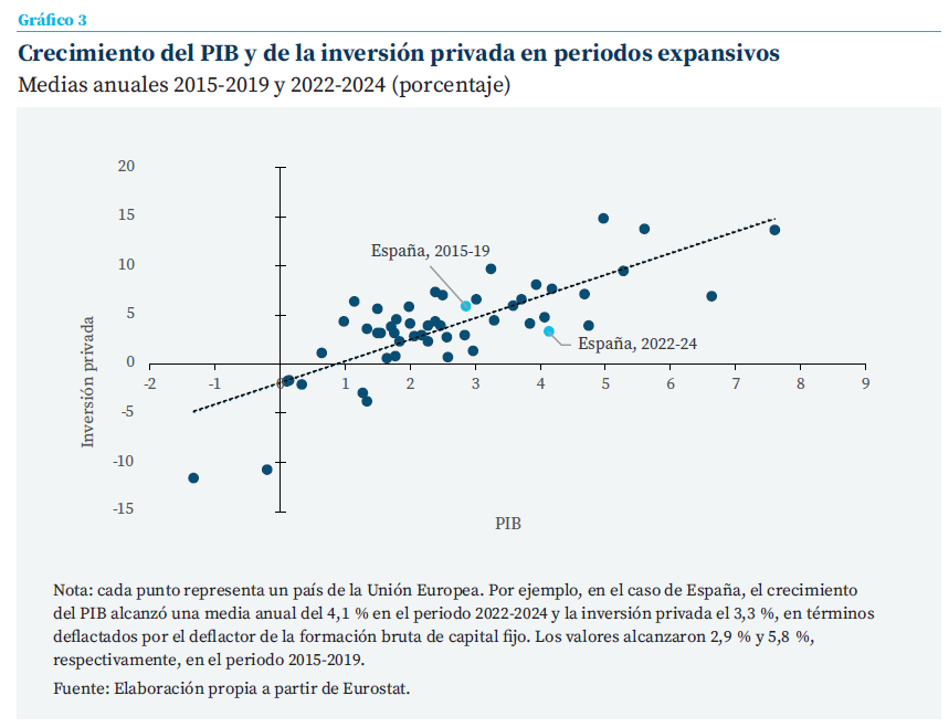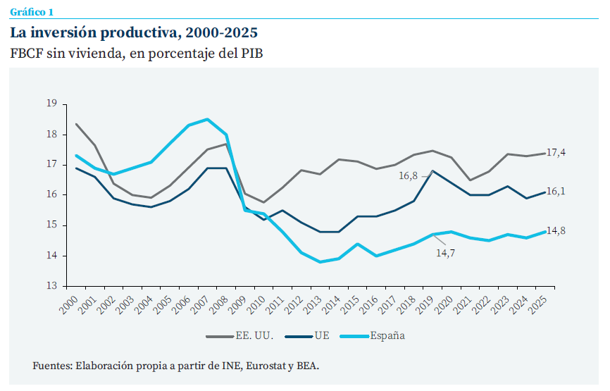 1 En el periodo 2019-2025, la ratio de inversión de las sociedades no financieras sobre el PIB ha descendido en 1,9 puntos porcentuales, frente a una media UE de -1,3 puntos porcentuales, con cálculos a partir de datos de Eurostat.