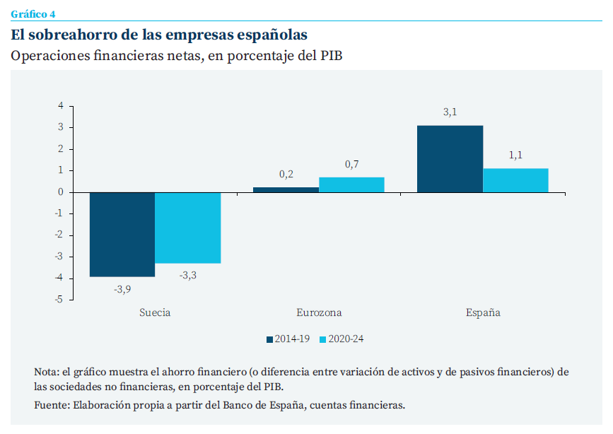 El remanente de ahorro, al no emplearse en invertir, se destina, por una parte, a acumular activos financieros como dinero en efectivo, depósitos bancarios, bonos y otras operaciones. Y, sobre todo, para reducir los pasivos. Concretamente, las empresas han acumulado patrimonio financiero (diferencia entre la variación de activos y de pasivos) por el equivalente del 2,2 % del PIB, en media anual en el periodo 2014-2024. Esto es cinco veces más que la media de la eurozona: ninguna de las grandes economías de la UE ha tenido un comportamiento tan cauteloso en este respecto. Todo ello redunda también en una fuerte reducción del endeudamiento empresarial, hasta niveles mínimos del siglo, y significativamente por debajo de la media europea.
