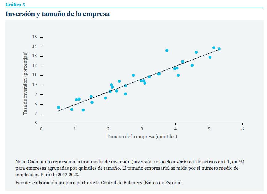 El clima de incertidumbre puede pesar más en las iniciativas de las pequeñas empresas, que componen el grueso del tejido productivo español, ya sea porque no disponen de personal cualificado para afrontarla, a diferencia de las grandes corporaciones que además tienen acceso a las consultoras más asentadas, o por-que su horizonte temporal suele ser más corto. Un tejido productivo atomizado es, por tanto, vulnerable al vaivén de la coyuntura. Además, las pequeñas empresas se enfrentan a más dificultades que las grandes para acceder a la financiación externa. Los préstamos bancarios que se les conceden entrañan una prima de riesgo, encareciendo el coste de la inversión. Por su parte, las corporaciones consolidadas no solo tienen acceso a una financiación más barata, sino que también pueden atraer recursos no bancarios, ya sea recurriendo directamente a los mercados de deuda y a fondos de inversión, o apelando a los accionistas. De ahí que se constate una relación creciente entre inversión y tamaño empresarial (gráfico 5).