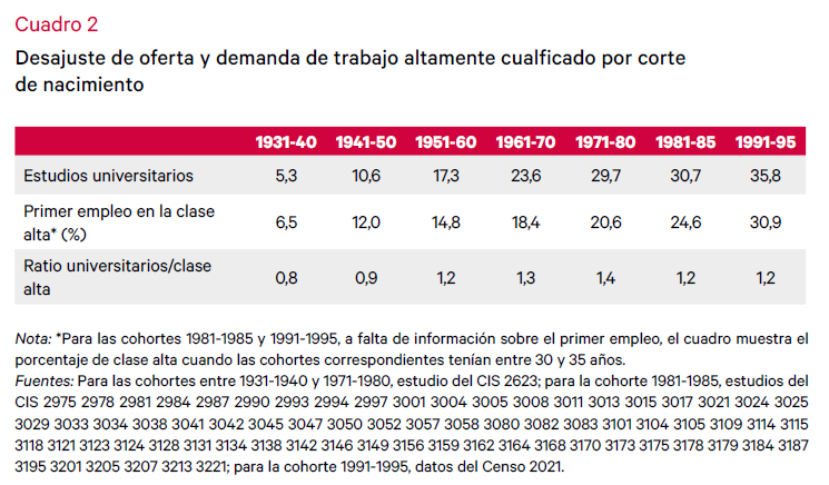Además de las estrategias de las clases altas, que con la intención de que sus vástagos eviten descender socialmente alteran el funcionamiento del ascensor educativo, existe una razón más estructural que limita el éxito de la expansión educativa para reducir las desigualdades sociales y favorecer la movilidad social. En la primera fila del cuadro 2 se presenta el porcentaje de individuos que han alcanzado estudios universitarios según distintas cohortes de nacimiento. En la fila inferior se muestra el porcentaje de la misma cohorte que ha obtenido un primer empleo en la clase alta. Los datos de las cohortes 1981-1985 y 1991-1995 no son directamente comparables con los de cohortes anteriores, pero aun así el cuadro proporciona evidencia sobre las tendencias a lo largo del tiempo.
