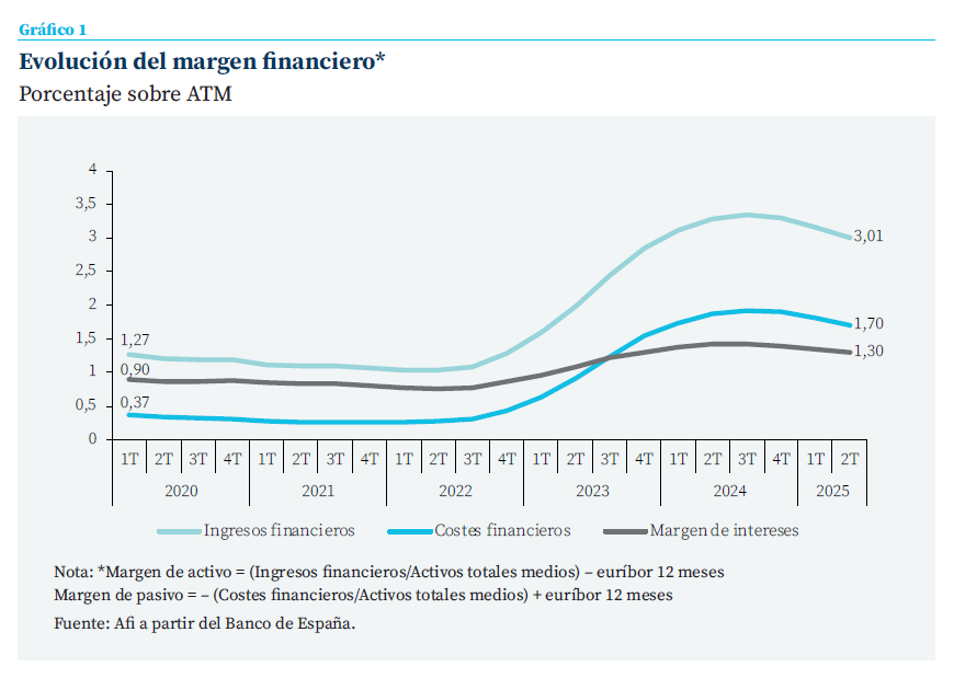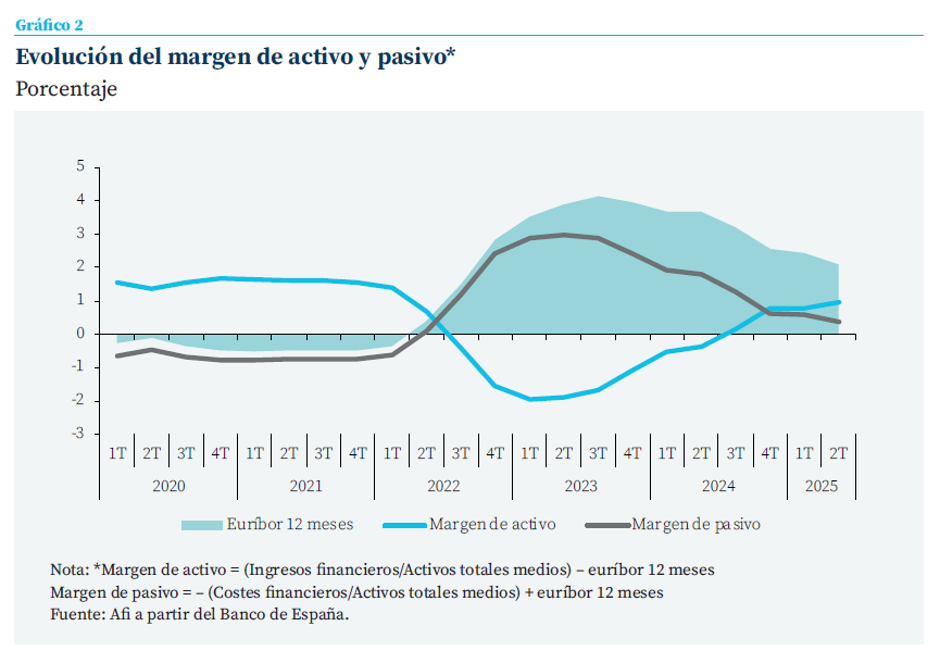 El retorno del efecto positivo en volumen del saldo de crédito en 2025, en conjunto con el retardado traslado de los incrementos de tipos a la rentabilidad de la cartera de renta fija, podría haber contribuido a amortiguar la disminución de la rentabilidad efectiva del activo