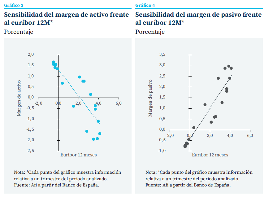 En conjunto, los resultados ponen de manifiesto que la aportación relativa de cada margen depende de forma crítica de la fase del ciclo de tipos de referencia. Tal como ilustran los gráficos 3 y 4, la sensibilidad (“beta”) del margen de activo es negativa frente al euríbor 12M (-24 pb por cada 1 % de subida), mientras que el margen de pasivo muestra una sensibilidad positiva y de mayor magnitud (“beta” de +45 pb). Esto implica que, ante un incremento del 1 % del euríbor, la compresión del diferencial del activo se ve más que compensada por la mejora del diferencial del pasivo, generando un efecto neto positivo sobre el margen financiero agregado. En un ciclo de bajadas y entendiendo que las sensibilidades ante cambios en el euríbor no funcionan de forma simétrica a lo largo de toda la muestra, el mecanismo operaría a la inversa, mostrando una mejora del margen de activo, que alivia parcialmente el deterioro del margen de pasivo, pero no lo neutraliza por completo. De este modo, y como ilustra el mencionado gráfico 2, el margen de intermediación se ha “nutrido” del pasivo en el ciclo de tipos altos, mientras que en el de bajos era el activo el único que contribuía de forma positiva al margen.
