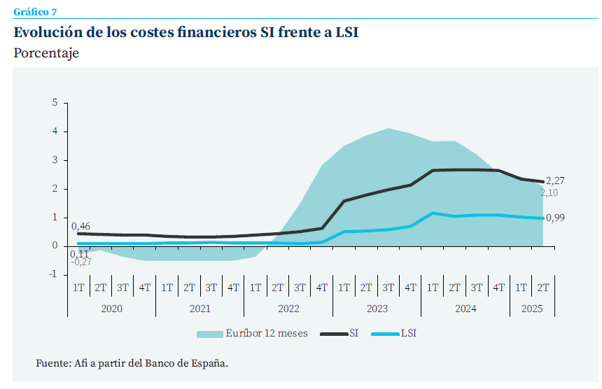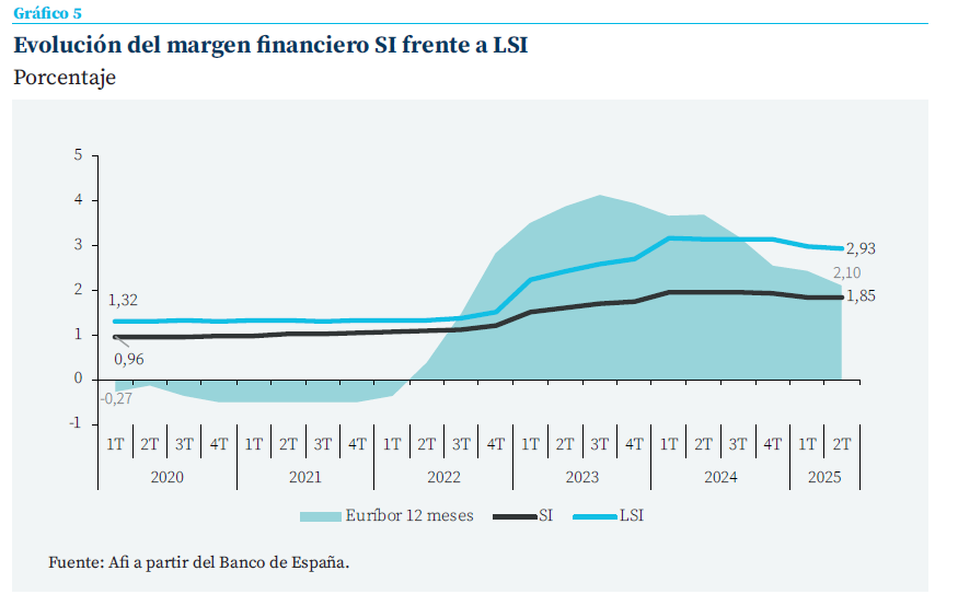 Pero, de nuevo, la principal divergencia se observa en los costes financieros. Las SI continúan soportando un coste del pasivo superior al de las LSI, coherente con un modelo de financiación con mayor peso de recursos mayoristas y emisiones vinculadas a requerimientos regulatorios.