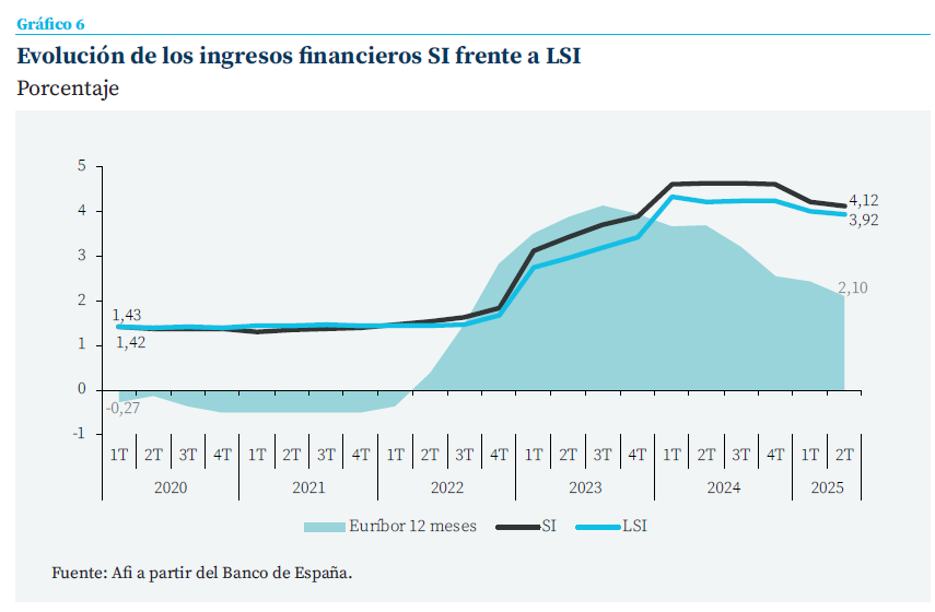 Adicionalmente, la corrección de los ingresos financieros en el caso de las entidades LSI podría estar condicionada por la mayor presencia de excedentes de liquidez en el balance de estas entidades, en línea con la progresiva reducción de la remuneración de estos saldos depositados a la Facilidad de Depósito, limitando su capacidad para sostener los volúmenes de ingresos en un contexto de descenso de tipos.