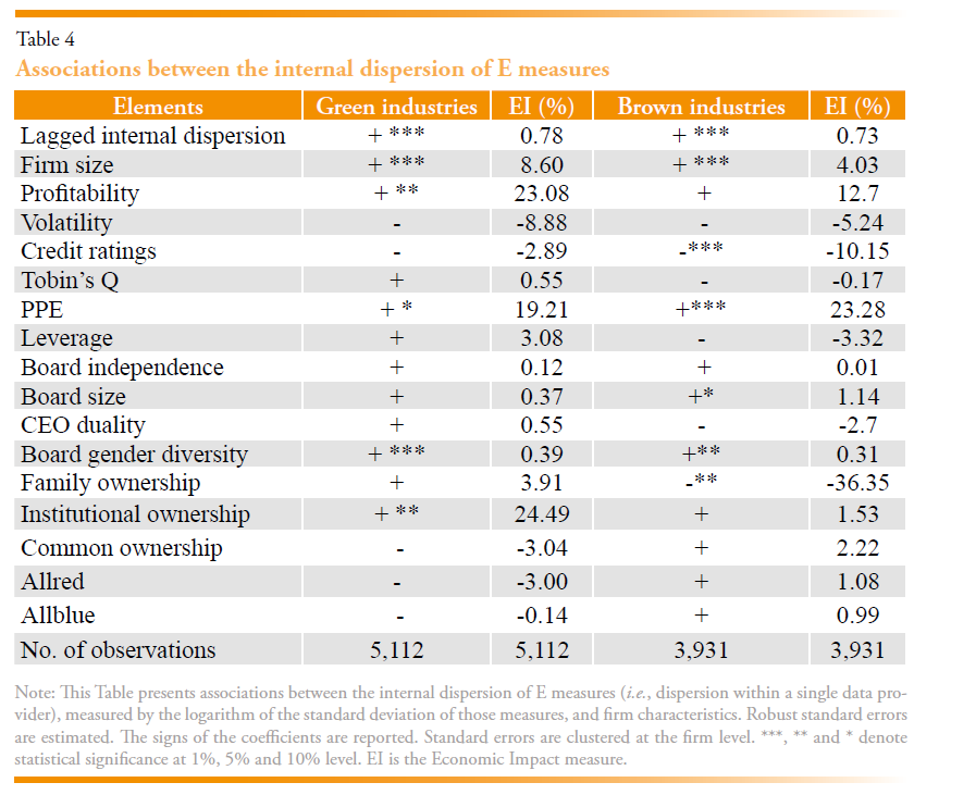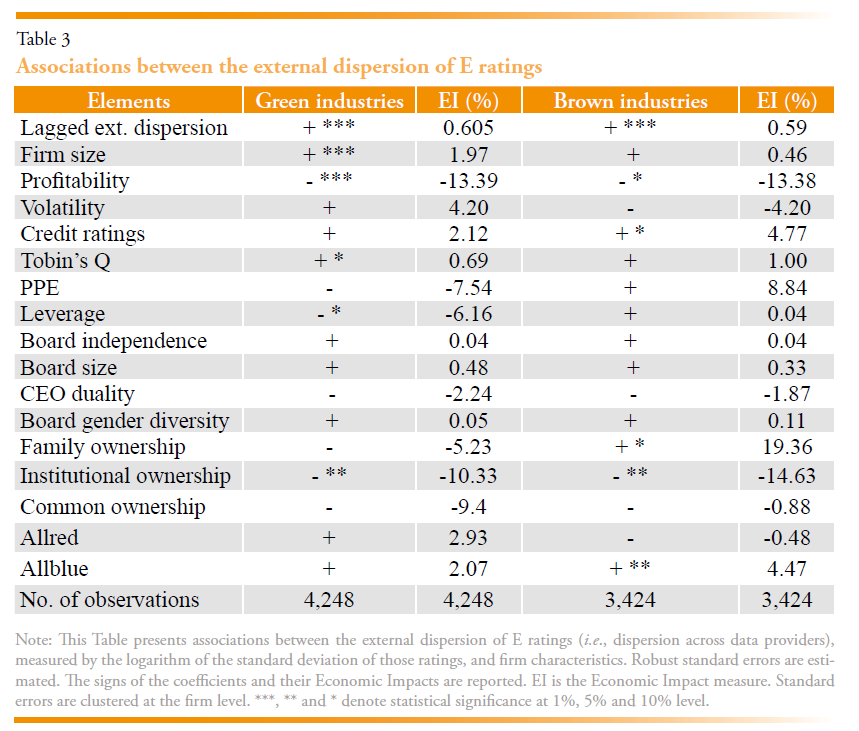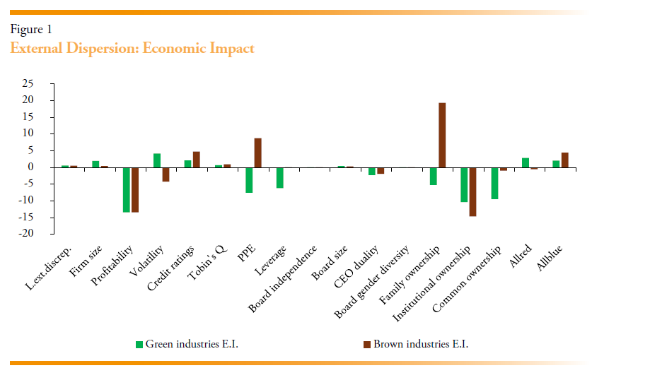 This paper aims to explore factors that may explain the dispersion of environmental ratings across industrial sectors. The paper studies external dispersion –the discrepancy in E ratings across raters–, and internal dispersion –the discrepancy across E dimensions within a single rater. We classify industrial sectors by their degree of “greenness” or “brownness” based on their unscaled greenhouse gas (GHG) emissions. We study the impact of characteristics such as the ownership structure (including common ownership, institutional ownership, or family ownership), the proportion of independent directors on the board, the degree of CEO duality, and board- and executive-level gender diversity on the dispersion of environmental ratings. External dispersion mainly reflects cross-rater comparability problems driven by firm complexity, ownership structure, and political context, whereas internal dispersion captures persistent within-rater heterogeneity across environmental dimensions. External dispersion primarily signals methodological divergence across providers, whereas internal dispersion reflects informative multidimensional environmental performance.