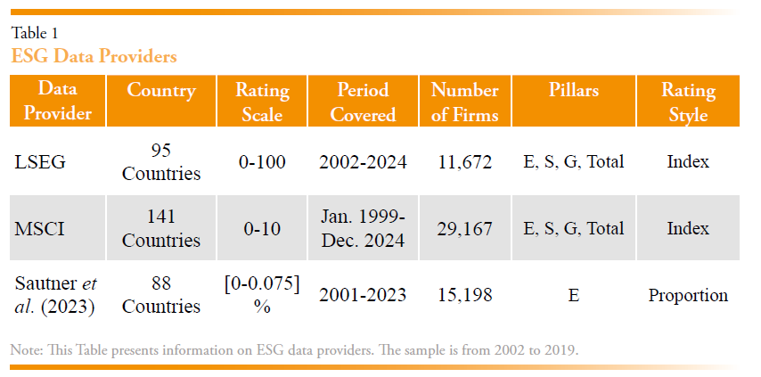 Chatterji et al. (2016) show considerable disagreement among the ESG ratings of the top data providers. Huber and Comstock (2017) note that providers’ methodologies, scopes, and coverage of reports and ratings vary significantly. Christensen et al. (2021) present evidence that companies that provide more information about their ESG factors exhibit the most significant disagreement (or variation) in their ESG ratings. In addition, the greater the disagreement between ESG ratings, the higher the volatility of equity returns and the lower the likelihood of resorting to external financing. Therefore, this indicates that more