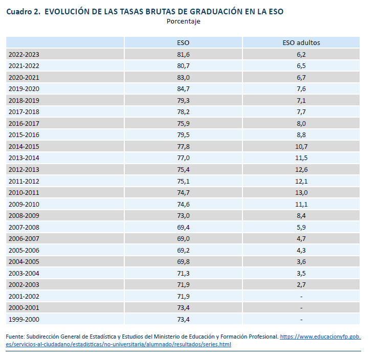Los datos conocidos en diciembre de 2024 muestran que la tasa bruta de graduados se ha recuperado en alguna medida hasta registrar el 81,6 % del curso 2022-2023, aún lejos del máximo del 2019-2020. En definitiva, España tiene una elevada tasa de abandono por la falta de jóvenes que titulan ESO: uno de cada cinco jóvenes no logra finalizar la ESO en los institutos o centros educativos. La ESO también se puede alcanzar después, en la educación para adultos. El cuadro 2 muestra que la proporción de personas que alcanza el título de enseñanza obligatorio en los años preceptivos, durante las segundas oportunidades, está descendiendo desde el 13,0 % (sobre la cohorte de edad de los 18 años) en 2010-2011 hasta la mitad del 6,2 % en 2022-2023, lo que se explica por el aumento de los titulados en la ESO en los institutos. El rango de edades de estos titulados es bastante amplio, aunque el peso de los jóvenes que han dejado recientemente la etapa obligatoria sea importante (MEFP, 2023).