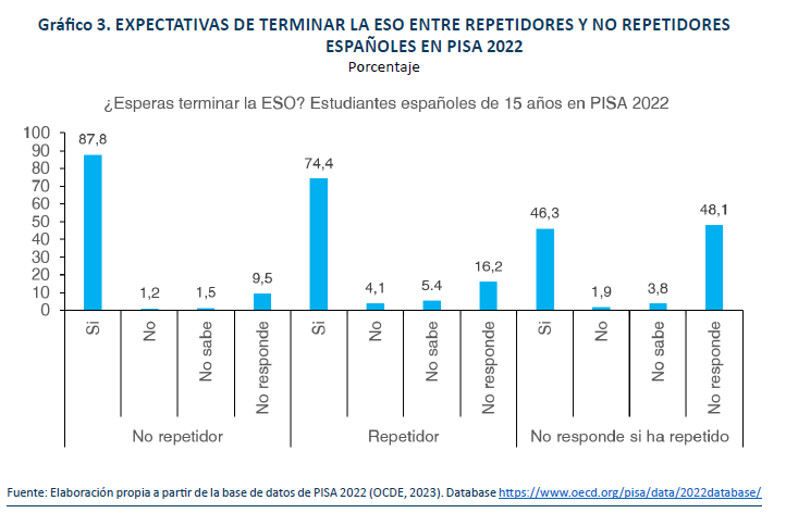 El análisis de las expectativas académicas de los estudiantes españoles de 15 años con los datos de PISA 2022 nos permite examinar las características del alumnado que podría estar en riesgo de abandonar su formación, lo que podría ayudar a desarrollar estrategias más dirigidas y personalizadas para apoyar su permanencia en el sistema educativo. El sistema educativo español tiene más repetidores, tanto en primaria como en la ESO, que el promedio de la OCDE. En PISA 2022, un 10,1 % del alumnado español había repetido en primaria al menos una vez, una proporción que es casi el doble que el 5,8 % de la OCDE (OCDE, 2023b). Un 14,9 % de los estudiantes españoles de 15 años había repetido al menos en una ocasión algún curso de la ESO, cuando en los países más desarrollados ese porcentaje es del 4,2 %. El gráfico 3 muestra que el 87,8 % de los estudiantes no-repetidores españoles de 15 años señala que espera terminar la ESO, una proporción que disminuye hasta el 74,4 % entre los que han repetido alguna vez, ya sea en Primaria o en la ESO. Entre el alumnado que no responde si ha repetido, la proporción de los que esperan terminar la ESO es del 46,3 %, el 1,9 % señala que no cree terminar la ESO (mayor que el 1,2 % de entre los no-repetidores), el 3,8 % que no lo sabe (superior al 1,5 % de entre los no-repetidores) y un 48,1 % tampoco ha respondido sobre si espera terminar estos.