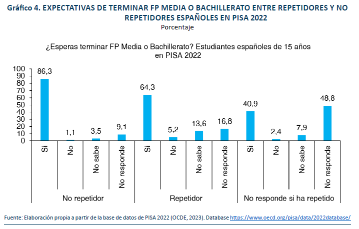 El gráfico 4 muestra que un 86,3 % de los estudiantes españoles de 15 años que no han repetido señalan en PISA 2022 que creen que terminarán FP Media o Bachillerato, el nivel mínimo que hay que finalizar para no considerar que se han abandonado tempranamente los estudios. Es un porcentaje muy similar al 87,8 % de los no repetidores españoles que esperaba finalizar la ESO. Entre los repetidores, un 74,4 % cree que va a finalizar la ESO (gráfico 1), pero bajan al 64,3 % los que esperan poder terminar FP Media o Bachillerato (gráfico 2). Es decir, que haber repetido al menos un curso, ya sea en Primaria o en la ESO, reduce las expectativas de titularse en enseñanzas medias. Esta es una primera conclusión importante, el abandono educativo parece centrarse en los estudiantes repetidores, por lo que las medidas destinadas a incentivar la continuidad en los estudios (como las campañas de publicidad sobre las consecuencias de dejar la formación tempranamente o las intervenciones para elevar las expectativas) debería tener como objetivo más relevante a este tipo de alumnado. Los que no responden a la pregunta del cuestionario de PISA sobre si han repetido, pero sí a la de si esperan terminar FP Media o Bachillerato, también tienen unas expectativas académicas más bajas que los que no han repetido nunca.
