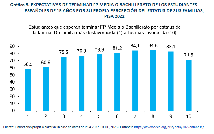 Un 22,49 % de los estudiantes españoles en PISA 2022 tiene expectativas de estudiar y finalizar Ciclos Formativos de Grado Medio (CFGM) y un 61,29 % Bachillerato. La suma de los que esperan terminar CFGM y Bachillerato es prácticamente la misma que los que esperan terminar la ESO (81,44 %), porque este último nivel es un paso previo para poder realizar uno de los dos siguientes (aunque hay algunas vías de acceder a FP Media sin el título de la ESO). Es decir, los estudiantes de 15 años que esperan finalizar la ESO tienen la expectativa de continuar estudiando y terminar FP Media o Bachillerato. Analizando los datos de la Encuesta de población activa (EPA), Jansen y Lacuesta (2024) concluyen también que el porcentaje de estudiantes que no sigue estudiando a pesar de graduarse en la ESO se ha reducido considerablemente en las últimas décadas, un nuevo patrón de continuidad formativa postobligatoria, que ha sido clave para la reducción del abandono escolar. Una vez logrado que la inmensa mayoría de estudiantes que finaliza la ESO continué con sus estudios, el siguiente reto de la educación española sería conseguir que el alumnado que comienza el siguiente nivel educativo lo finalice. El 28,6 % del alumnado español que comenzó FP Media en 2017-2018 no había finalizado esta etapa, ni seguía matriculado en ningún otro estudio, cuatro años más tarde (MEFP, 2023). Un 9,3 % de los estudiantes españoles que comienzan Bachillerato tampoco ha finalizado estos estudios cuatro años más tarde (OCDE, 2023). Finalizar Ciclos Formativos de Grado Medio o Bachillerato es el nivel requerido para considerar que un joven no ha abandonado tempranamente los estudios, porque es la formación mínima para poder afrontar con garantías la inserción laboral y social de adulto.