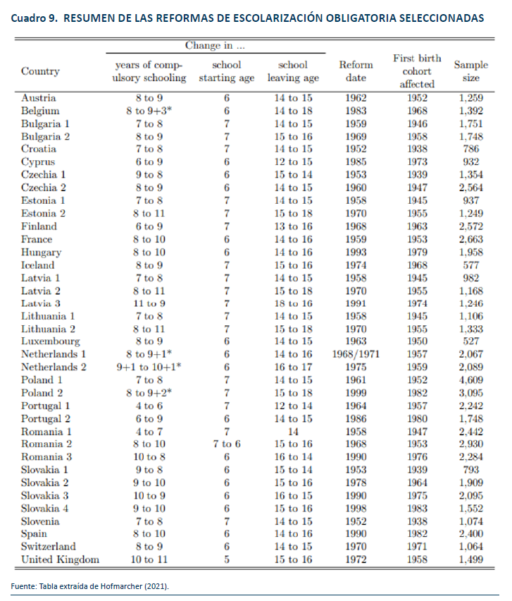 El cuadro 9 (extraído del artículo de Hofmarcher, 2021) presenta las reformas educativas europeas, donde se evidencia una clara discontinuidad en el número promedio de años de educación completados en la primera cohorte afectada por las reformas. Hofmarcher (2021) enumera las 37 reformas en 23 países que cumplen con los criterios de selección y que utiliza en su análisis principal. De estas reformas, 20 implicaron un aumento o disminución de un año en la duración de la educación obligatoria, ocho reformas involucraron tanto incrementos como reducciones de dos y tres años, y una de ellas supuso un cambio de cuatro años. En total, 32 reformas extendieron la duración de la educación obligatoria y cinco la redujeron. Las reformas se centraron en cambios en la duración de la escolarización obligatoria en niveles educativos aproximadamente similares, generalmente en el rango de 7 a 10 años.