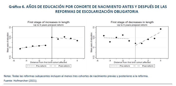 Más recientemente, Hofmarcher (2021) realizó un análisis comparativo en 32 países europeos, en el cual se observa la relación entre las reformas que extienden la educación obligatoria y los años promedio de escolarización completados por los jóvenes. El estudio identifica una clara discontinuidad en los años promedio de educación en torno al punto de implementación de la reforma, lo que sugiere un cambio significativo en la tendencia educativa antes y después de la entrada en vigor de dicha medida. Este cambio se traduce en un aumento en el número de jóvenes que completan al menos un año adicional de educación, con beneficios a largo plazo tanto a nivel personal como social. Hofmarcher (2021) concluye que un año adicional de educación reduce en un 29 % el riesgo de pobreza y en un 17 % las dificultades económicas. Además, el estudio destaca el impacto positivo de la educación en otros indicadores, como la reducción de la privación material severa y la percepción de estabilidad económica.