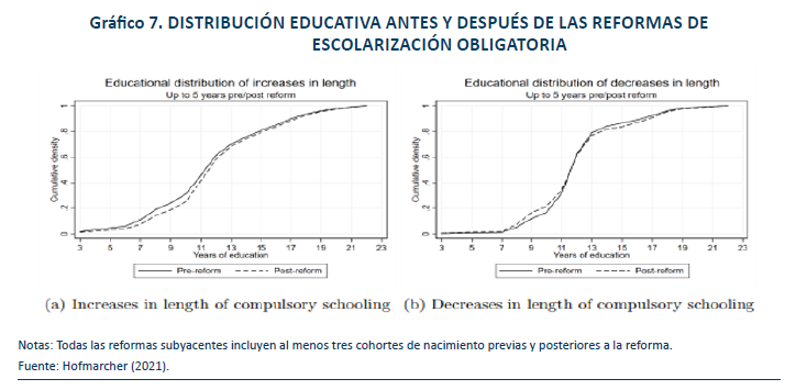 El gráfico 6, por su parte, muestra la distribución educativa completa y cómo se ha desplazado en respuesta a los cambios en la duración de la educación obligatoria. La mayoría del desplazamiento se concentra en torno al nuevo número mayor de años de educación obligatoria, lo que sugiere que las reformas efectivamente movieron a algunos estudiantes desde el nivel inferior previo al nuevo nivel establecido, es decir, aquellos que solo asisten a la escuela mientras están obligados a hacerlo.