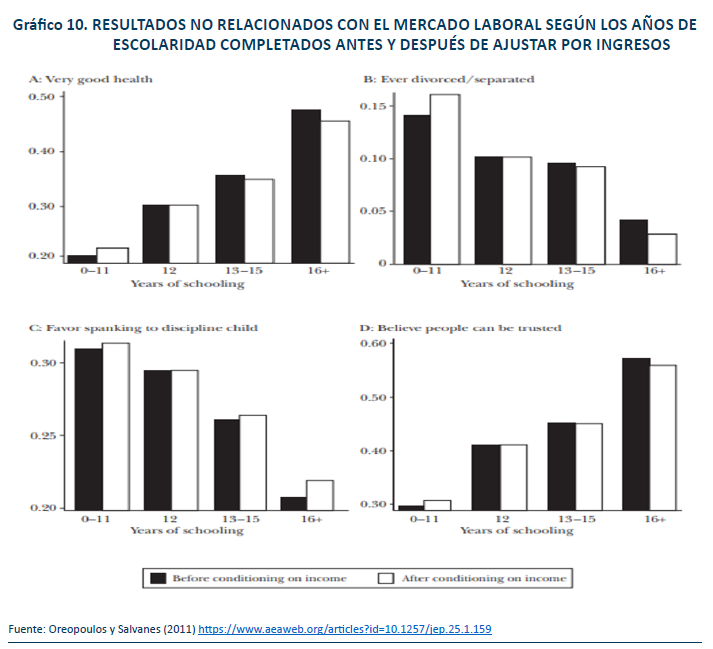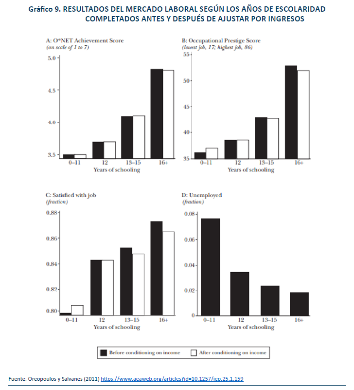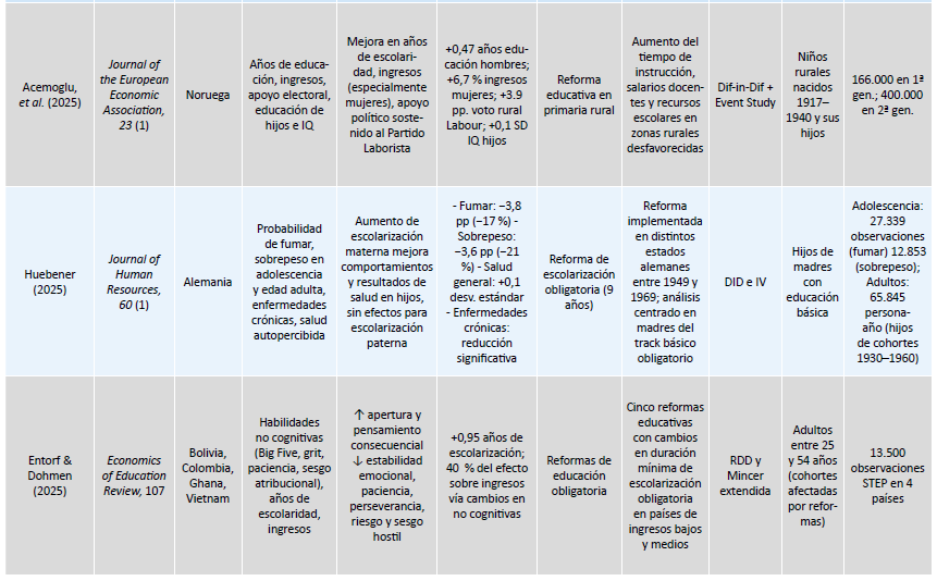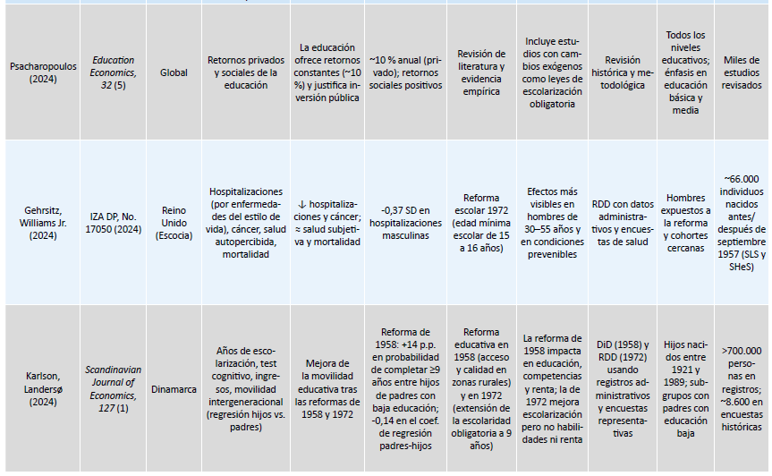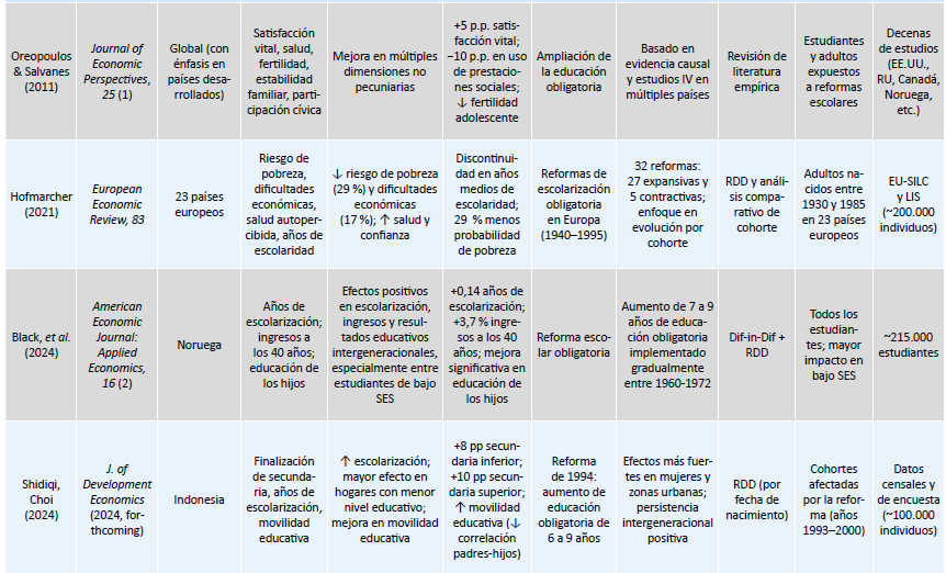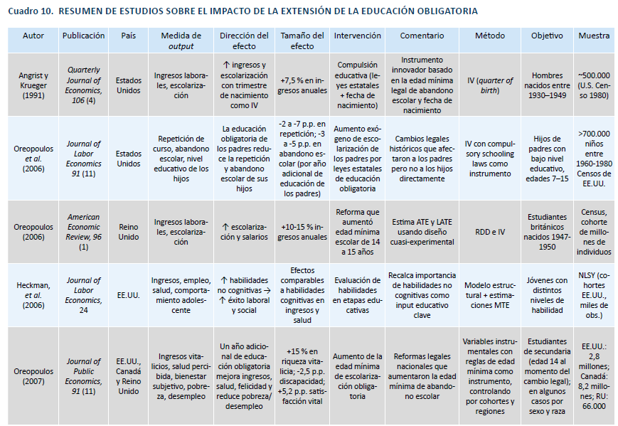 El trabajo pionero de Angrist y Krueger (1991) sobre reformas educativas en Estados Unidos evidenció que un año adicional de educación incrementa en un 10 % los ingresos laborales anuales de los individuos, en promedio. El estudio utiliza una metodología de variables instrumentales para evaluar el efecto causal de la reforma educativa y concluye que la educación adicional permite acceder a empleos de mayor estabilidad y calidad, reduciendo la probabilidad de desempleo y dependencia de prestaciones sociales.