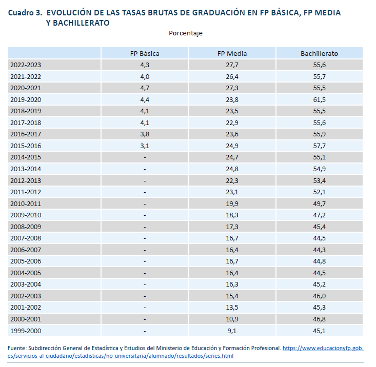En 2021-2022, hubo una corrección de ese aumento tan importante del curso anterior, aunque la titulación en FP Media continuaba cerca de los máximos históricos (26,4 %). En Bachillerato, como en FP Básica, sí se ha corregido todo el aumento circunstancial que se produjo en la tasa bruta de graduación desde el 55,5 % en 2018-2019 al 61,5 % en 2019-2020 para retornar de nuevo al 55,5 % en el 2020-2021, 55,7 % en el 2021-2022 y 55,6 % en 2022-2023. En FP Media, 2022-2023 registró máximo histórico de titulados en relación con la cohorte de edad de los 17 años.