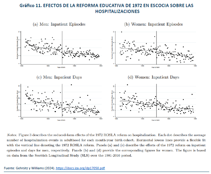Oreopoulos (2007) utiliza datos de Estados Unidos, Canadá y Reino Unido para estimar los efectos de los cambios en las leyes de escolarización obligatoria sobre distintos indicadores de bienestar. Los resultados muestran que un año adicional de educación obligatoria incrementa la riqueza vitalicia en torno al 15 %, incluso después de descontar el ingreso dejado de percibir por permanecer más tiempo en la escuela. Además, se observan mejoras en múltiples dimensiones no económicas: una reducción de entre 2 y 3 puntos porcentuales en la probabilidad de reportar mala salud, una disminución del 6 % en la probabilidad de caer por debajo del umbral de pobreza y un aumento significativo en la satisfacción vital y en los niveles de felicidad autoevaluados. Los efectos son especialmente pronunciados en los grupos con menor nivel educativo inicial, lo que refuerza la idea de que estas políticas tienen un impacto redistributivo y pueden actuar como un mecanismo eficaz de equidad intergeneracional. Por tanto, la extensión de la escolarización obligatoria no solo amplía las oportunidades educativas, sino que también genera retornos sostenidos en salud, ingresos y bienestar psicológico a lo largo del ciclo de vida. Además, como muestran Oreopoulos et al. (2006), un año adicional de educación obligatoria para los padres reduce en hasta 7 puntos porcentuales la probabilidad de que sus hijos repitan curso y en hasta 5 puntos la probabilidad de que abandonen los estudios antes de completar la educación secundaria, lo que indica efectos intergeneracionales claros de este tipo de políticas. En el Reino Unido, Oreopoulos y Salvanes (2011) confirmaron este resultado al estudiar la reforma que elevó la edad mínima de abandono escolar de 14 a 15 años. Los resultados muestran que la reforma redujo el uso de prestaciones sociales en un 10 % y disminuyó la pobreza en un 8 %.