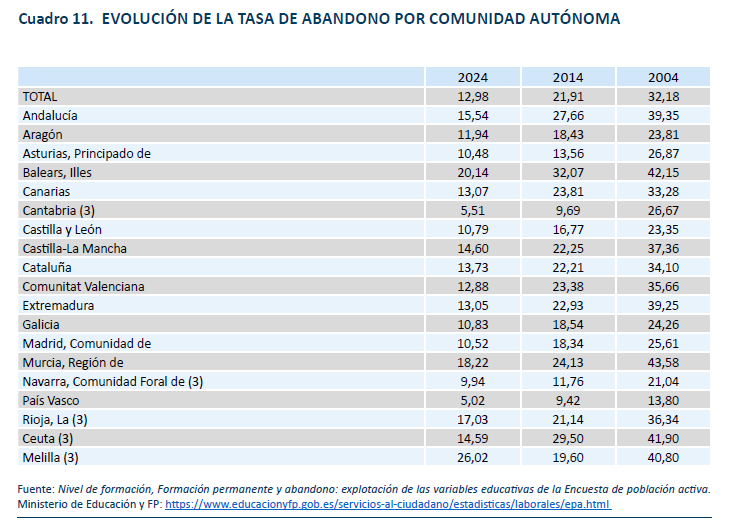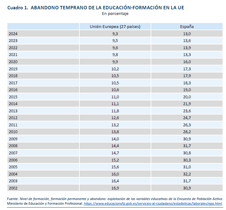 A pesar de que la tasa de abandono educativo temprano en España ha disminuido del 13,9 % en 2022 al 13,0 % en 2024 (12,6 % en lo que llevamos de año de 2025), el país sigue situándose por encima de la media de la UE y lejos del objetivo del 9 % establecido para 2030. Reducir el abandono temprano es crucial no solo para mejorar las oportunidades laborales de los jóvenes, sino también para contribuir al crecimiento económico y la cohesión social del país. La evidencia empírica muestra que prolongar la educación obligatoria puede traducirse en beneficios económicos tangibles, como un aumento en la productividad y los ingresos laborales futuros.