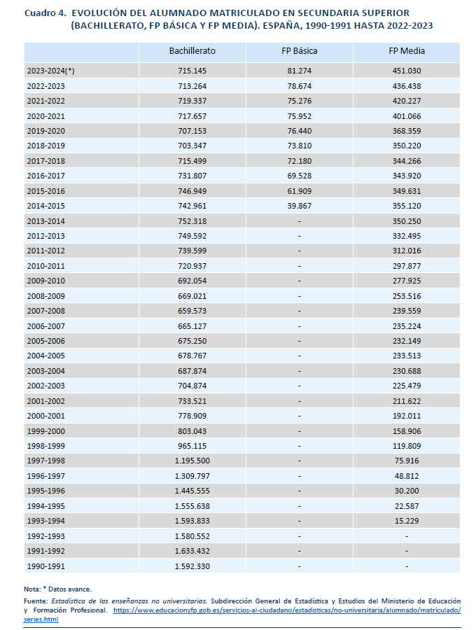 El cuadro 3 ha mostrado la evolución de la titulación en FP Básica, FP Media y Bachillerato, niveles educativos que si se finalizan, se considera que los jóvenes no han abandonado tempranamente los estudios. El cuadro 4 complementa esta información con los datos de matriculación en las tres enseñanzas, que son indicadores adelantados de lo que puede ocurrir en los próximos años.